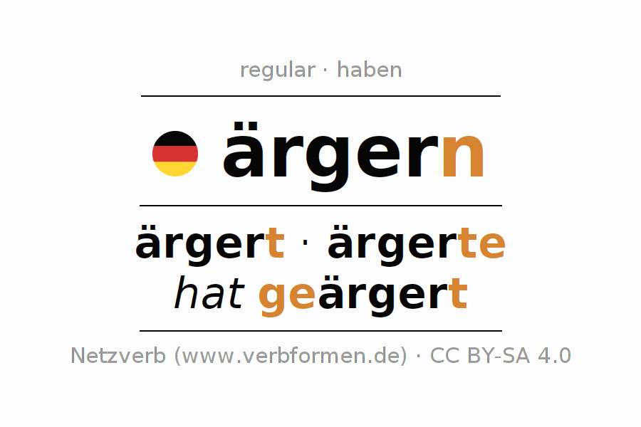 - Pasado perfecto: ich habe geärgert, du hast geärgert, er hat geärgert, wir haben geärgert, ihr habt geärgert, sie haben geärgert