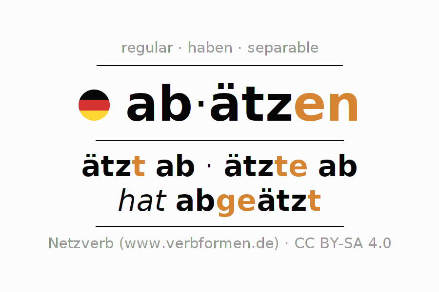 - Presente: ätz(e) (du) ab, ätzen wir ab, ätzt (ihr) ab, ätzen Sie ab