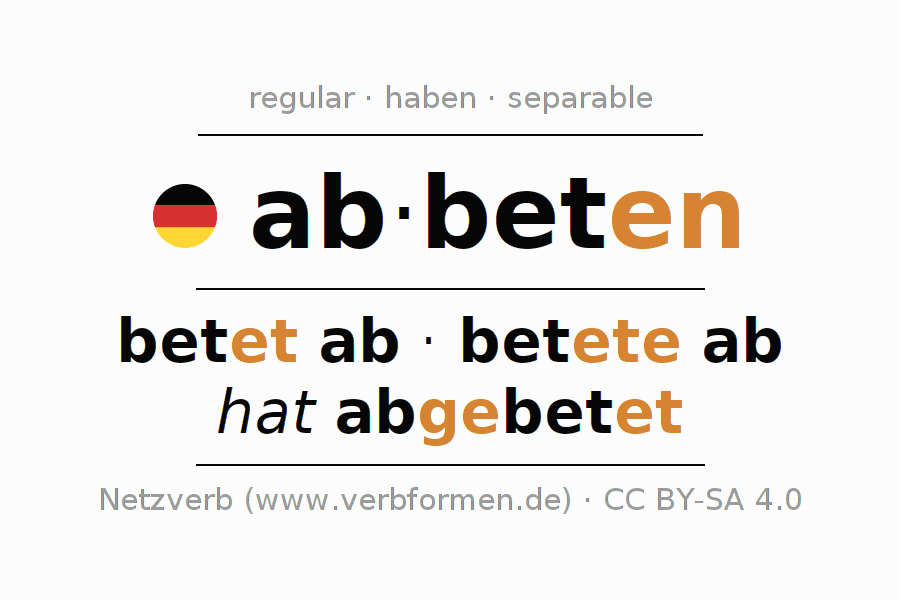 - Presente: bet(e) (du) ab, beten wir ab, betet (ihr) ab, beten Sie ab