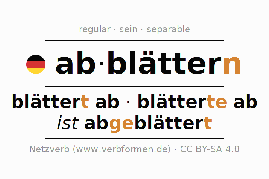 - Pasado perfecto: ich bin abgeblättert, du bist abgeblättert, er ist abgeblättert, wir sind abgeblättert, ihr seid abgeblättert, sie sind abgeblättert