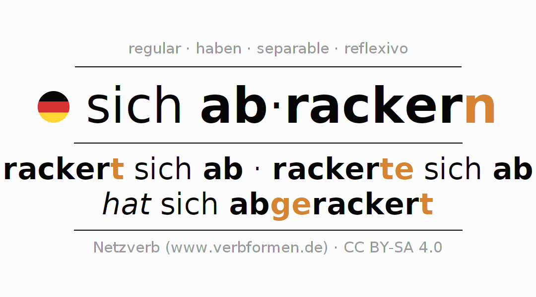 - Pasado perfecto: ich habe mir/mich abgerackert, du hast dir/dich abgerackert, er hat sich abgerackert, wir haben uns abgerackert, ihr habt euch abgerackert, sie haben sich abgerackert