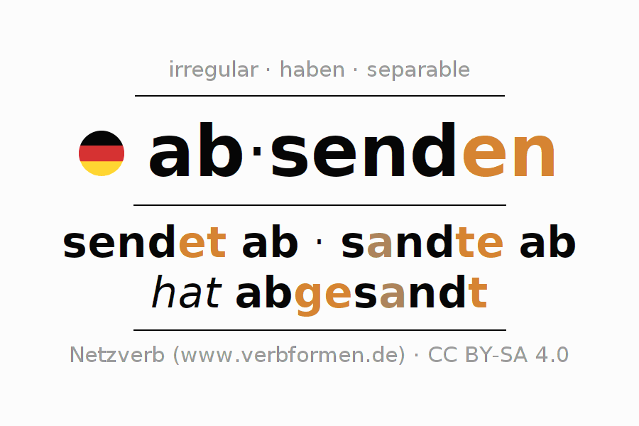 - Presente: ich send(e) ab, du sendest ab, er sendet ab, wir senden ab, ihr sendet ab, sie senden ab