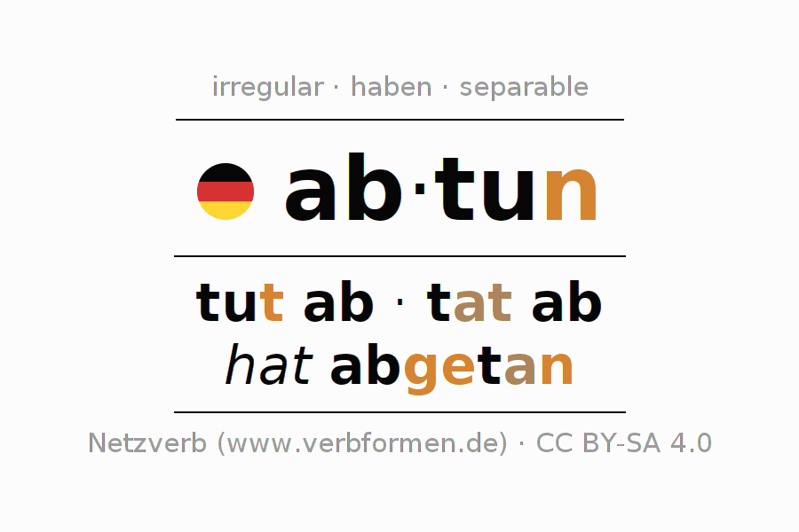 Tablas de verbos para la conjugación de ab·tun en línea, representadas de forma simple, con todas las construcciones verbales en singular y plural, en todas las personas gramaticales (1ª persona, 2ª persona, 3ª persona). El practicar la conjugación del verbo ab·tun es útil para tareas, exámenes, la escuela, la universidad, las clases de alemán y para los estudiantes adultos. Especialmente para los estudiantes del alemán es muy importante el conjugar los verbos y el formar las raíces verbales de forma correcta. Aquí encuentras más información acerca del tema Wiktionary abtun und unter abtun im Duden.