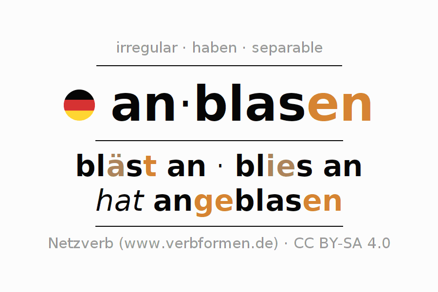 - Presente: blas(e) (du) an, blasen wir an, blast (ihr) an, blasen Sie an