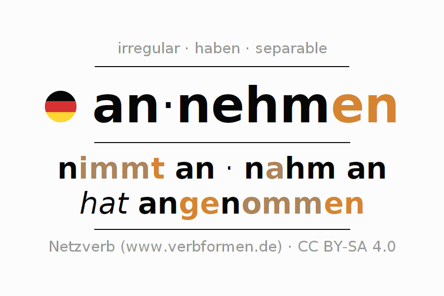 - Presente: ich nehm(e) an, du nimmst an, er nimmt an, wir nehmen an, ihr nehmt an, sie nehmen an