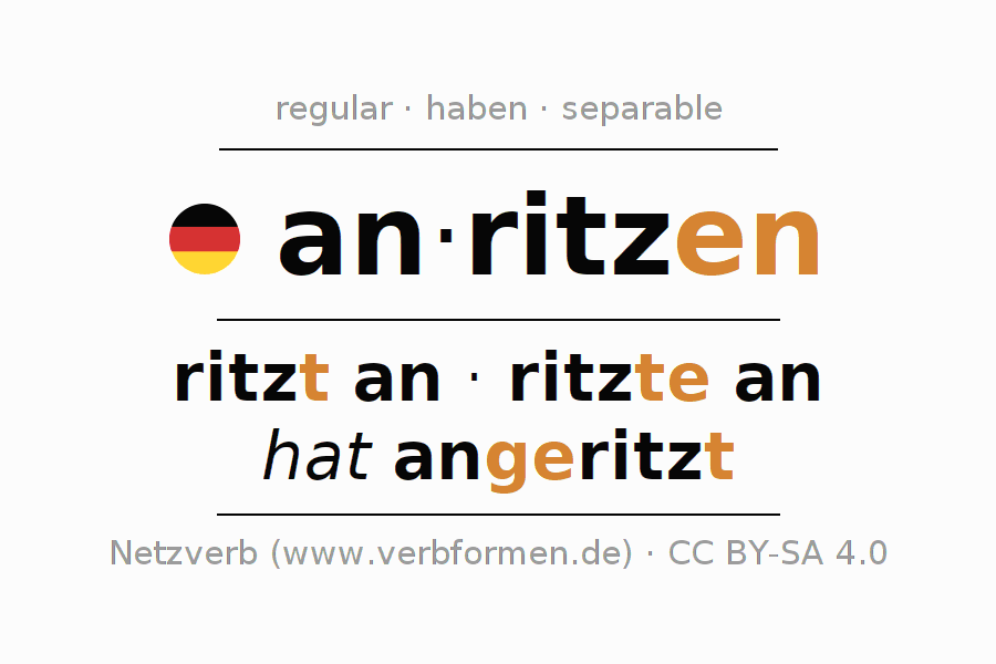 - Presente: ritz(e) (du) an, ritzen wir an, ritzt (ihr) an, ritzen Sie an