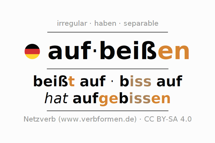 - Pasado perfecto: ich habe aufgebissen, du hast aufgebissen, er hat aufgebissen, wir haben aufgebissen, ihr habt aufgebissen, sie haben aufgebissen