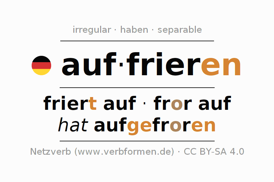 Tablas de verbos para la conjugación de auf·frieren en línea, representadas de forma simple, con todas las construcciones verbales en singular y plural, en todas las personas gramaticales (1ª persona, 2ª persona, 3ª persona). El practicar la conjugación del verbo auf·frieren es útil para tareas, exámenes, la escuela, la universidad, las clases de alemán y para los estudiantes adultos. Especialmente para los estudiantes del alemán es muy importante el conjugar los verbos y el formar las raíces verbales de forma correcta. Aquí encuentras más información acerca del tema Wiktionary auffrieren und unter auffrieren im Duden.