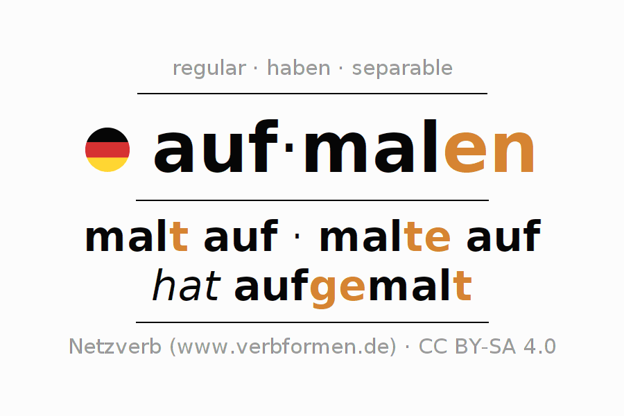 - Pasado perfecto: ich habe aufgemalt, du hast aufgemalt, er hat aufgemalt, wir haben aufgemalt, ihr habt aufgemalt, sie haben aufgemalt