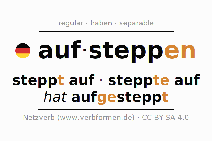 - Presente: stepp(e) (du) auf, steppen wir auf, steppt (ihr) auf, steppen Sie auf
