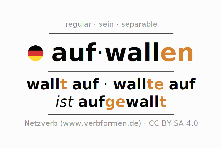 - Presente: wall(e) (du) auf, wallen wir auf, wallt (ihr) auf, wallen Sie auf
