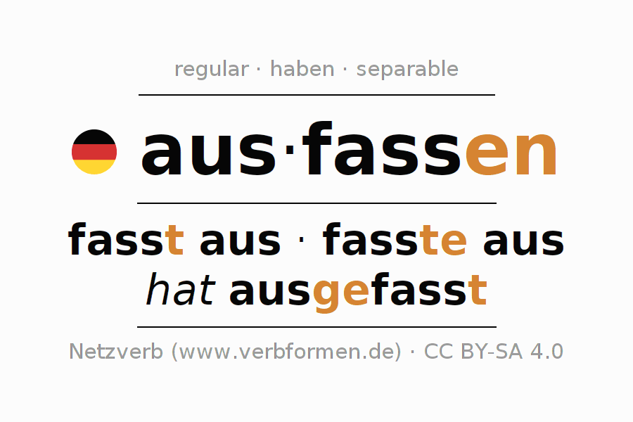 - Presente: fass(e) (du) aus, fassen wir aus, fasst (ihr) aus, fassen Sie aus