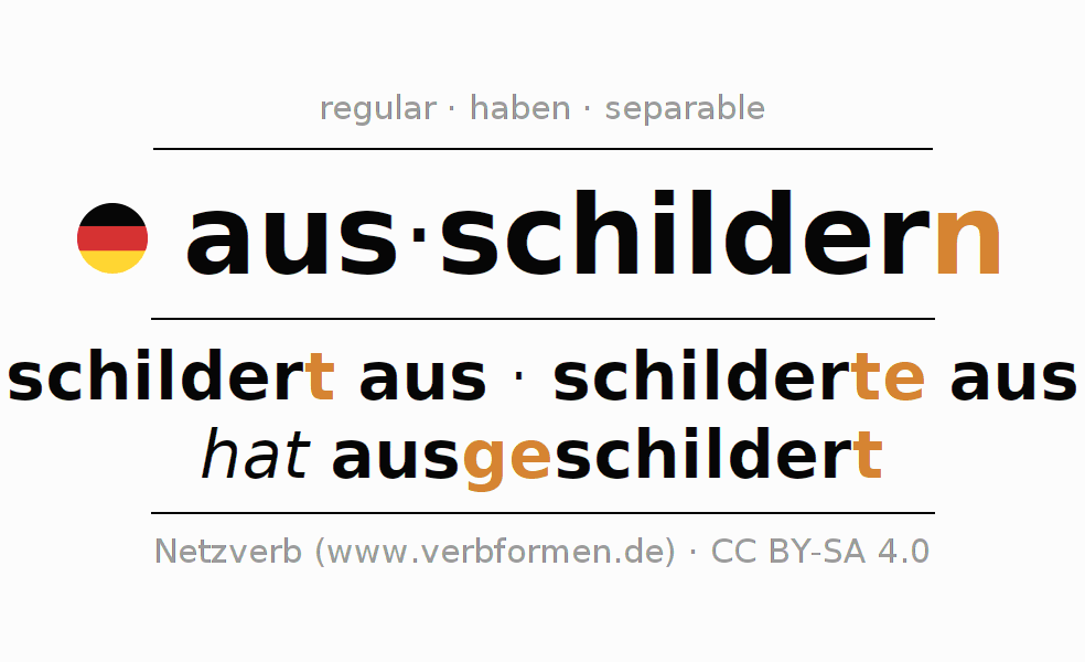 - Presente: schild(e)r(e) (du) aus, schildern wir aus, schildert (ihr) aus, schildern Sie aus