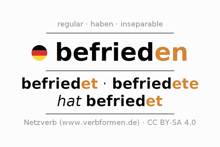 - Pasado perfecto: ich habe befriedet, du hast befriedet, er hat befriedet, wir haben befriedet, ihr habt befriedet, sie haben befriedet
