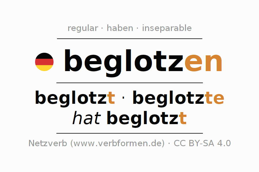 El verbo beglotzen (contemplar, mirar fijamente) se conjuga de forma regular (conjugación débil). Las formas básicas son beglotzt, beglotzte y hat beglotzt. puesto que es un verbo auxiliar de beglotzen se utiliza el verbo auxiliar "haben". La primera sílaba be- de beglotzen no es separable. La inflexión se hace en el genero Activo y se presenta como Oración principal.. Para aprender mejor tenemos disponibles innumerables ejemplos para el uso del verbo beglotzen. Para practicar y reforzar tenemos también hojas de trabajo gratuitas para beglotzen. Aquí podrás conjugar, no solamente el verbo beglotzen, sino también todos los verbos alemanes. Este verbo pertenece al vocabulario necesario para pasar el examen "Zertifikat Deutsch" o para el nivel C2. Comentarios ☆