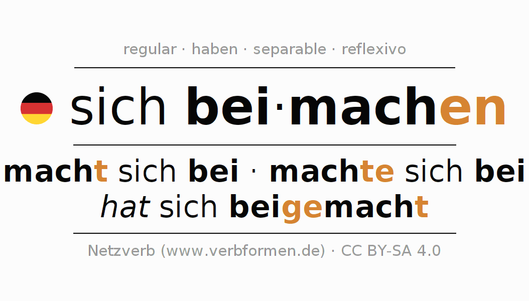 Tablas de verbos para la conjugación de sich bei·machen en línea, representadas de forma simple, con todas las construcciones verbales en singular y plural, en todas las personas gramaticales (1ª persona, 2ª persona, 3ª persona). El practicar la conjugación del verbo sich bei·machen es útil para tareas, exámenes, la escuela, la universidad, las clases de alemán y para los estudiantes adultos. Especialmente para los estudiantes del alemán es muy importante el conjugar los verbos y el formar las raíces verbales de forma correcta. Aquí encuentras más información acerca del tema Wiktionary beimachen und unter beimachen im Duden.