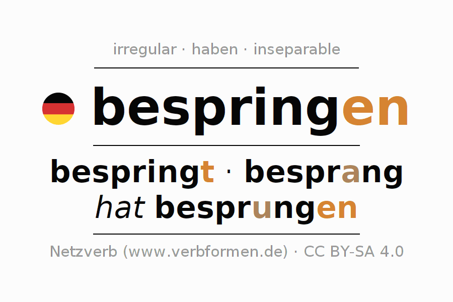 - Pasado perfecto: ich habe besprungen, du habest besprungen, er habe besprungen, wir haben besprungen, ihr habet besprungen, sie haben besprungen