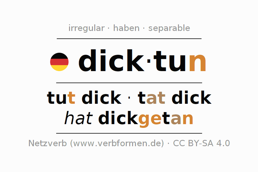 - Pasado perfecto: ich habe dickgetan, du hast dickgetan, er hat dickgetan, wir haben dickgetan, ihr habt dickgetan, sie haben dickgetan