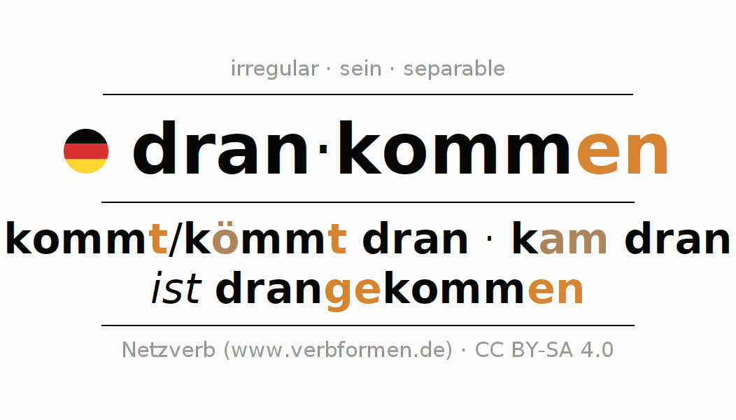 - Presente: ich komm(e) dran, du kommst/kömmst dran, er kommt/kömmt dran, wir kommen dran, ihr kommt dran, sie kommen dran