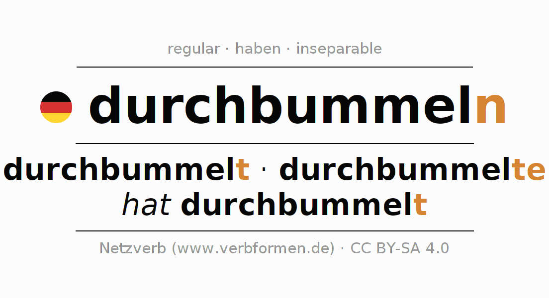 - Pasado perfecto: ich habe durchbummelt, du hast durchbummelt, er hat durchbummelt, wir haben durchbummelt, ihr habt durchbummelt, sie haben durchbummelt