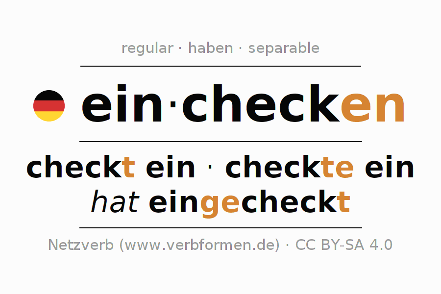 - Presente: check(e) (du) ein, checken wir ein, checkt (ihr) ein, checken Sie ein