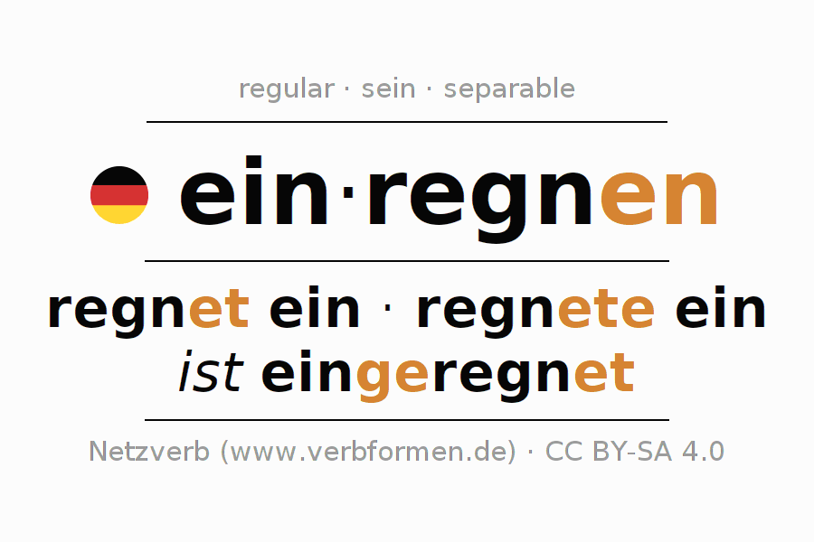- Presente: regne (du) ein, regnen wir ein, regnet (ihr) ein, regnen Sie ein
