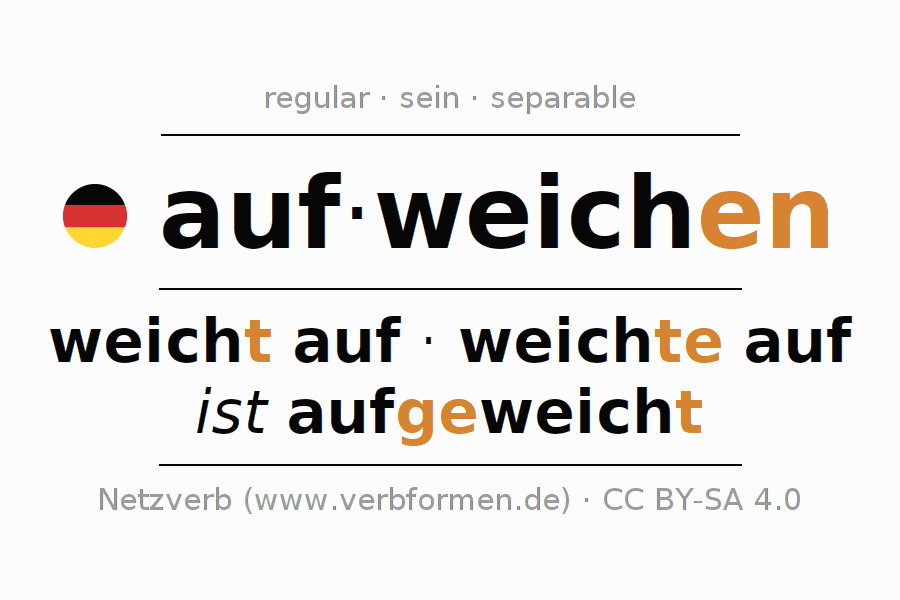 Ejemplos para la conjugación del infinitivo aufweichen. Aquí tenemos fragmentos de texto reales y oraciones tomadas del proyecto Tatoeba. Por cada tipo de conjugación hay un ejemplo y la forma verbal se encuentra destacada. A veces hay más de una oración, pero en ese caso se seleccionará automáticamente un ejemplo del verbo alemán en cuestión. Para que además de aprender también practiques la conjugación del verbo, tenemos para ti Arbeitsblätter und Übungen hojas de trabajo disponibles.