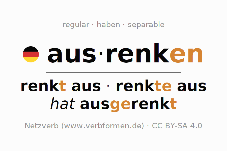 Ejemplos para la conjugación del infinitivo ausrenken. Aquí tenemos fragmentos de texto reales y oraciones tomadas del proyecto Tatoeba. Por cada tipo de conjugación hay un ejemplo y la forma verbal se encuentra destacada. A veces hay más de una oración, pero en ese caso se seleccionará automáticamente un ejemplo del verbo alemán en cuestión. Para que además de aprender también practiques la conjugación del verbo, tenemos para ti Arbeitsblätter und Übungen hojas de trabajo disponibles.