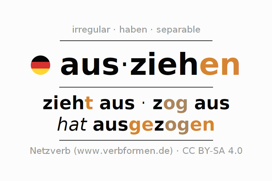 Ejemplos para la conjugación del infinitivo ausziehen. Aquí tenemos fragmentos de texto reales y oraciones tomadas del proyecto Tatoeba. Por cada tipo de conjugación hay un ejemplo y la forma verbal se encuentra destacada. A veces hay más de una oración, pero en ese caso se seleccionará automáticamente un ejemplo del verbo alemán en cuestión. Para que además de aprender también practiques la conjugación del verbo, tenemos para ti Arbeitsblätter und Übungen hojas de trabajo disponibles.