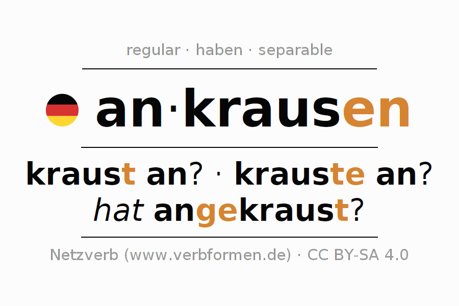Ejemplos para la conjugación del infinitivo ankrausen. Aquí tenemos fragmentos de texto reales y oraciones tomadas del proyecto Tatoeba. Por cada tipo de conjugación hay un ejemplo y la forma verbal se encuentra destacada. A veces hay más de una oración, pero en ese caso se seleccionará automáticamente un ejemplo del verbo alemán en cuestión. Para que además de aprender también practiques la conjugación del verbo, tenemos para ti Arbeitsblätter und Übungen hojas de trabajo disponibles.
