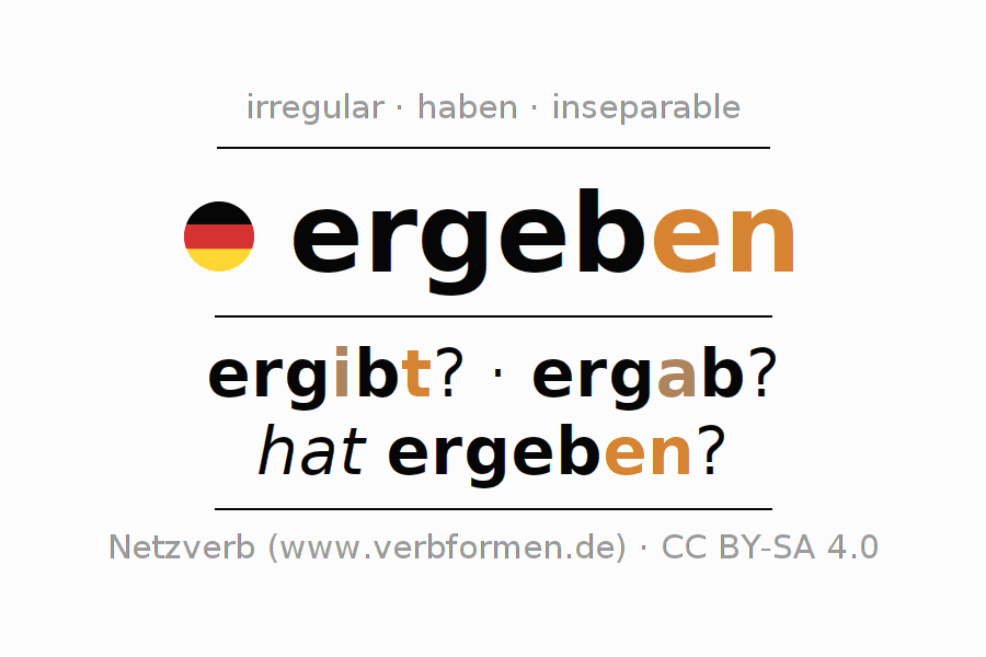 Ejemplos para la conjugación del infinitivo ergeben. Aquí tenemos fragmentos de texto reales y oraciones tomadas del proyecto Tatoeba. Por cada tipo de conjugación hay un ejemplo y la forma verbal se encuentra destacada. A veces hay más de una oración, pero en ese caso se seleccionará automáticamente un ejemplo del verbo alemán en cuestión. Para que además de aprender también practiques la conjugación del verbo, tenemos para ti Arbeitsblätter und Übungen hojas de trabajo disponibles.
