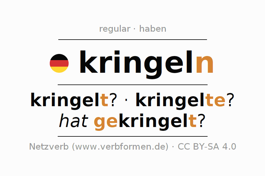Ejemplos para la conjugación del infinitivo kringeln. Aquí tenemos fragmentos de texto reales y oraciones tomadas del proyecto Tatoeba. Por cada tipo de conjugación hay un ejemplo y la forma verbal se encuentra destacada. A veces hay más de una oración, pero en ese caso se seleccionará automáticamente un ejemplo del verbo alemán en cuestión. Para que además de aprender también practiques la conjugación del verbo, tenemos para ti Arbeitsblätter und Übungen hojas de trabajo disponibles.