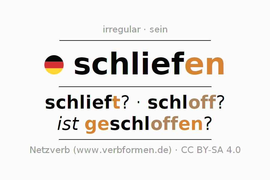Ejemplos para la conjugación del infinitivo schliefen. Aquí tenemos fragmentos de texto reales y oraciones tomadas del proyecto Tatoeba. Por cada tipo de conjugación hay un ejemplo y la forma verbal se encuentra destacada. A veces hay más de una oración, pero en ese caso se seleccionará automáticamente un ejemplo del verbo alemán en cuestión. Para que además de aprender también practiques la conjugación del verbo, tenemos para ti Arbeitsblätter und Übungen hojas de trabajo disponibles.