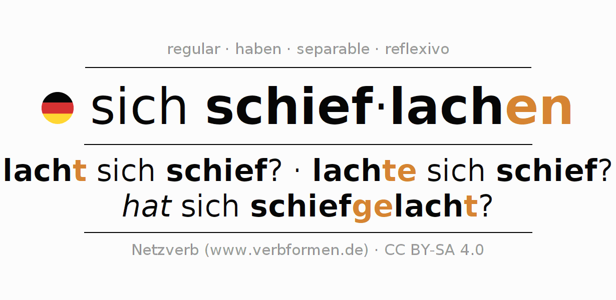 Ejemplos para la conjugación del infinitivo schieflachen. Aquí tenemos fragmentos de texto reales y oraciones tomadas del proyecto Tatoeba. Por cada tipo de conjugación hay un ejemplo y la forma verbal se encuentra destacada. A veces hay más de una oración, pero en ese caso se seleccionará automáticamente un ejemplo del verbo alemán en cuestión. Para que además de aprender también practiques la conjugación del verbo, tenemos para ti Arbeitsblätter und Übungen hojas de trabajo disponibles.