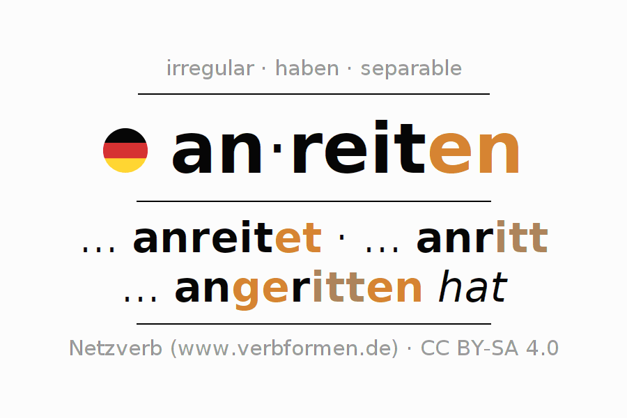Ejemplos para la conjugación del infinitivo anreiten. Aquí tenemos fragmentos de texto reales y oraciones tomadas del proyecto Tatoeba. Por cada tipo de conjugación hay un ejemplo y la forma verbal se encuentra destacada. A veces hay más de una oración, pero en ese caso se seleccionará automáticamente un ejemplo del verbo alemán en cuestión. Para que además de aprender también practiques la conjugación del verbo, tenemos para ti Arbeitsblätter und Übungen hojas de trabajo disponibles.