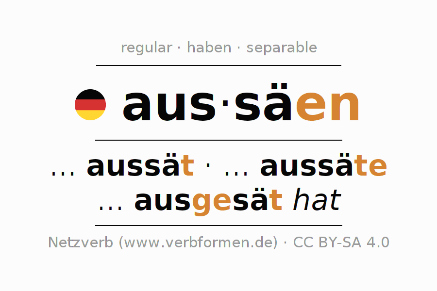 Ejemplos para la conjugación del infinitivo aussäen. Aquí tenemos fragmentos de texto reales y oraciones tomadas del proyecto Tatoeba. Por cada tipo de conjugación hay un ejemplo y la forma verbal se encuentra destacada. A veces hay más de una oración, pero en ese caso se seleccionará automáticamente un ejemplo del verbo alemán en cuestión. Para que además de aprender también practiques la conjugación del verbo, tenemos para ti Arbeitsblätter und Übungen hojas de trabajo disponibles.