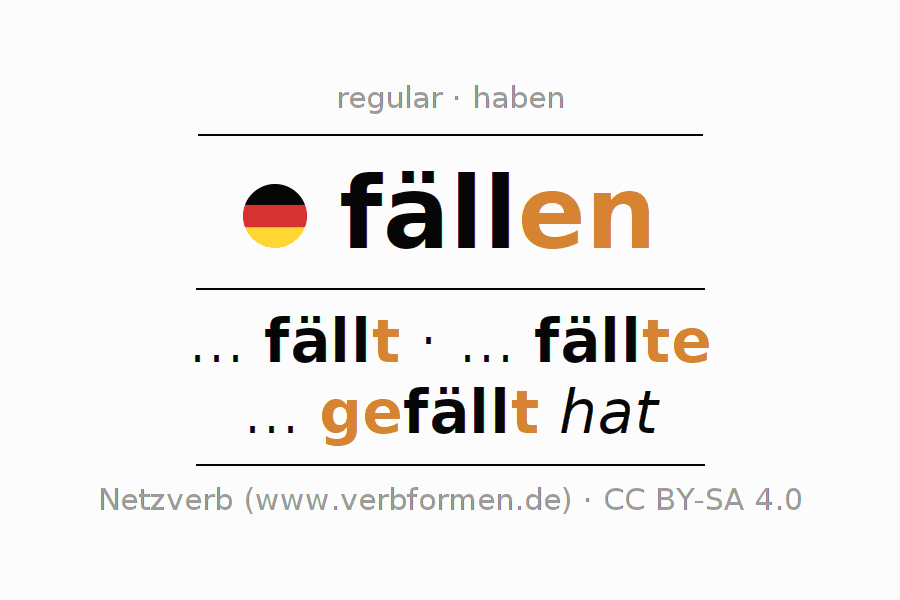 Ejemplos para la conjugación del infinitivo fällen. Aquí tenemos fragmentos de texto reales y oraciones tomadas del proyecto Tatoeba. Por cada tipo de conjugación hay un ejemplo y la forma verbal se encuentra destacada. A veces hay más de una oración, pero en ese caso se seleccionará automáticamente un ejemplo del verbo alemán en cuestión. Para que además de aprender también practiques la conjugación del verbo, tenemos para ti Arbeitsblätter und Übungen hojas de trabajo disponibles.