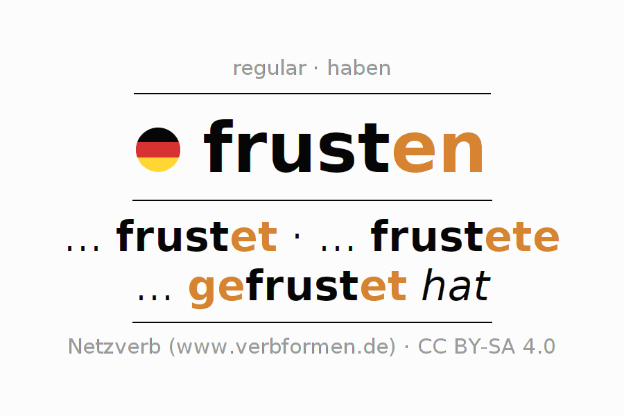 Ejemplos para la conjugación del infinitivo frusten. Aquí tenemos fragmentos de texto reales y oraciones tomadas del proyecto Tatoeba. Por cada tipo de conjugación hay un ejemplo y la forma verbal se encuentra destacada. A veces hay más de una oración, pero en ese caso se seleccionará automáticamente un ejemplo del verbo alemán en cuestión. Para que además de aprender también practiques la conjugación del verbo, tenemos para ti Arbeitsblätter und Übungen hojas de trabajo disponibles.