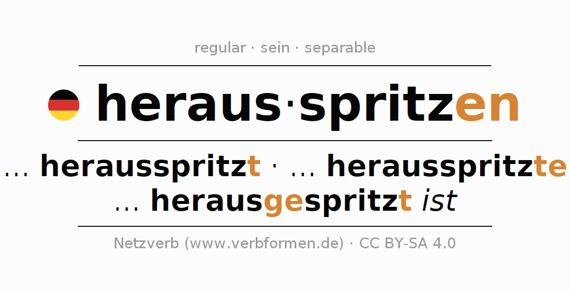 Ejemplos para la conjugación del infinitivo herausspritzen. Aquí tenemos fragmentos de texto reales y oraciones tomadas del proyecto Tatoeba. Por cada tipo de conjugación hay un ejemplo y la forma verbal se encuentra destacada. A veces hay más de una oración, pero en ese caso se seleccionará automáticamente un ejemplo del verbo alemán en cuestión. Para que además de aprender también practiques la conjugación del verbo, tenemos para ti Arbeitsblätter und Übungen hojas de trabajo disponibles.