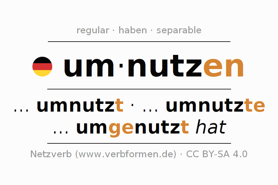 Ejemplos para la conjugación del infinitivo umnutzen. Aquí tenemos fragmentos de texto reales y oraciones tomadas del proyecto Tatoeba. Por cada tipo de conjugación hay un ejemplo y la forma verbal se encuentra destacada. A veces hay más de una oración, pero en ese caso se seleccionará automáticamente un ejemplo del verbo alemán en cuestión. Para que además de aprender también practiques la conjugación del verbo, tenemos para ti Arbeitsblätter und Übungen hojas de trabajo disponibles.