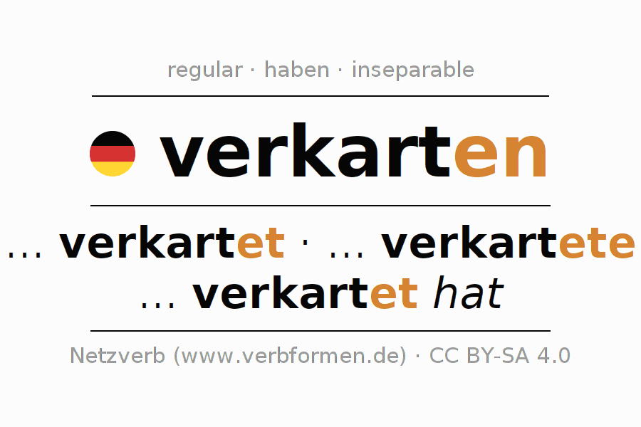 Ejemplos para la conjugación del infinitivo verkarten. Aquí tenemos fragmentos de texto reales y oraciones tomadas del proyecto Tatoeba. Por cada tipo de conjugación hay un ejemplo y la forma verbal se encuentra destacada. A veces hay más de una oración, pero en ese caso se seleccionará automáticamente un ejemplo del verbo alemán en cuestión. Para que además de aprender también practiques la conjugación del verbo, tenemos para ti Arbeitsblätter und Übungen hojas de trabajo disponibles.