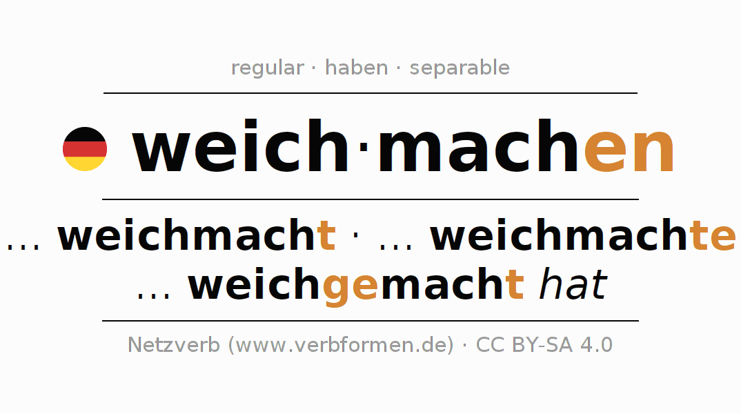 Ejemplos para la conjugación del infinitivo weichmachen. Aquí tenemos fragmentos de texto reales y oraciones tomadas del proyecto Tatoeba. Por cada tipo de conjugación hay un ejemplo y la forma verbal se encuentra destacada. A veces hay más de una oración, pero en ese caso se seleccionará automáticamente un ejemplo del verbo alemán en cuestión. Para que además de aprender también practiques la conjugación del verbo, tenemos para ti Arbeitsblätter und Übungen hojas de trabajo disponibles.
