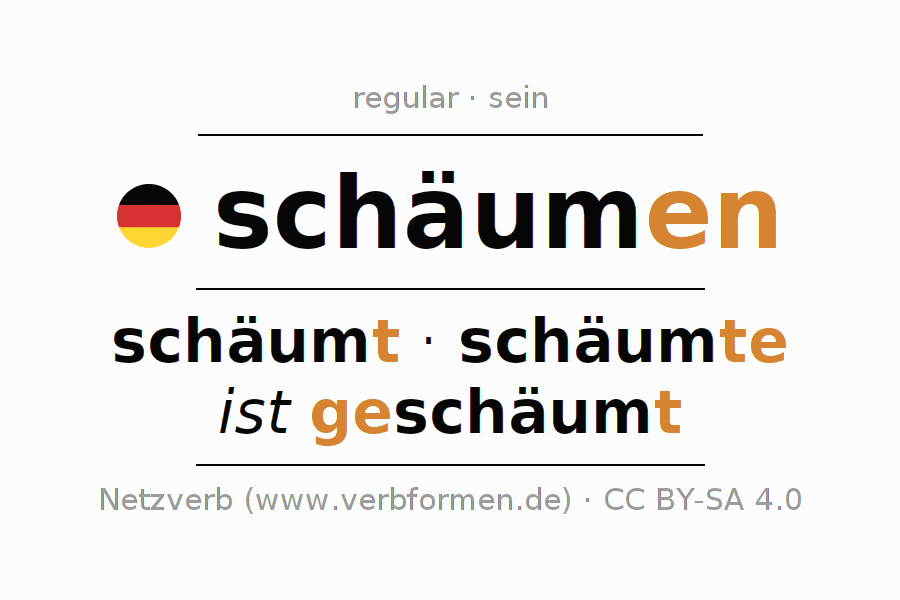 Ejemplos para la conjugación del infinitivo schäumen. Aquí tenemos fragmentos de texto reales y oraciones tomadas del proyecto Tatoeba. Por cada tipo de conjugación hay un ejemplo y la forma verbal se encuentra destacada. A veces hay más de una oración, pero en ese caso se seleccionará automáticamente un ejemplo del verbo alemán en cuestión. Para que además de aprender también practiques la conjugación del verbo, tenemos para ti Arbeitsblätter und Übungen hojas de trabajo disponibles.