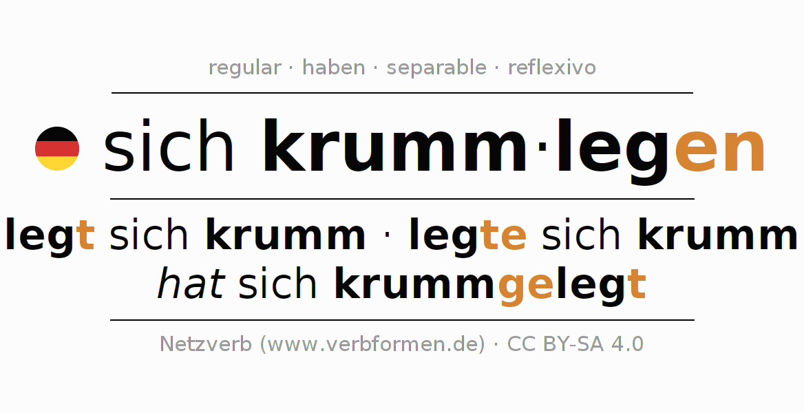Ejemplos para la conjugación del infinitivo krummlegen. Aquí tenemos fragmentos de texto reales y oraciones tomadas del proyecto Tatoeba. Por cada tipo de conjugación hay un ejemplo y la forma verbal se encuentra destacada. A veces hay más de una oración, pero en ese caso se seleccionará automáticamente un ejemplo del verbo alemán en cuestión. Para que además de aprender también practiques la conjugación del verbo, tenemos para ti Arbeitsblätter und Übungen hojas de trabajo disponibles.
