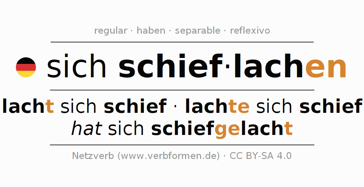 Ejemplos para la conjugación del infinitivo schieflachen. Aquí tenemos fragmentos de texto reales y oraciones tomadas del proyecto Tatoeba. Por cada tipo de conjugación hay un ejemplo y la forma verbal se encuentra destacada. A veces hay más de una oración, pero en ese caso se seleccionará automáticamente un ejemplo del verbo alemán en cuestión. Para que además de aprender también practiques la conjugación del verbo, tenemos para ti Arbeitsblätter und Übungen hojas de trabajo disponibles.