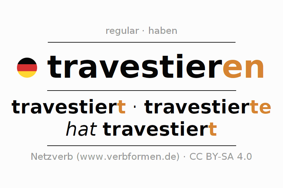 Ejemplos para la conjugación del infinitivo travestieren. Aquí tenemos fragmentos de texto reales y oraciones tomadas del proyecto Tatoeba. Por cada tipo de conjugación hay un ejemplo y la forma verbal se encuentra destacada. A veces hay más de una oración, pero en ese caso se seleccionará automáticamente un ejemplo del verbo alemán en cuestión. Para que además de aprender también practiques la conjugación del verbo, tenemos para ti Arbeitsblätter und Übungen hojas de trabajo disponibles.