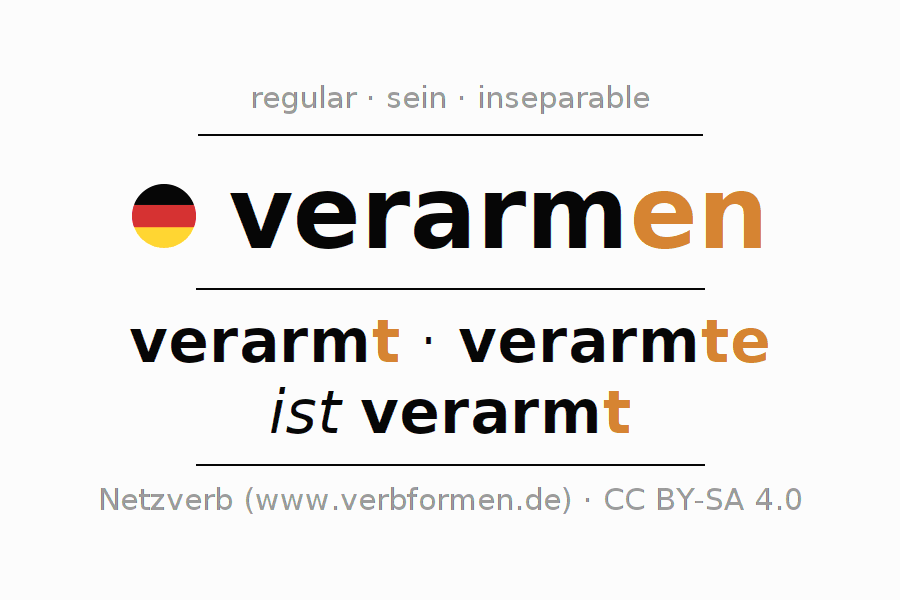 Ejemplos para la conjugación del infinitivo verarmen. Aquí tenemos fragmentos de texto reales y oraciones tomadas del proyecto Tatoeba. Por cada tipo de conjugación hay un ejemplo y la forma verbal se encuentra destacada. A veces hay más de una oración, pero en ese caso se seleccionará automáticamente un ejemplo del verbo alemán en cuestión. Para que además de aprender también practiques la conjugación del verbo, tenemos para ti Arbeitsblätter und Übungen hojas de trabajo disponibles.