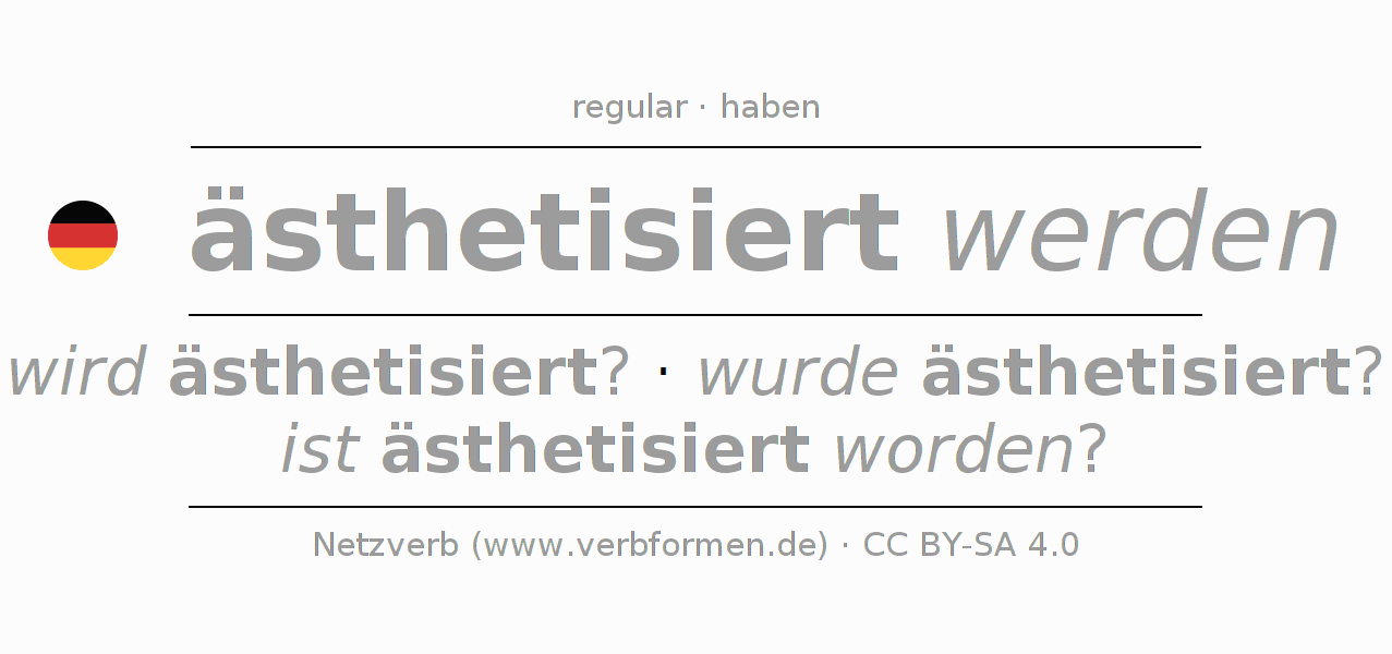 Ejemplos para la conjugación del infinitivo ästhetisieren. Aquí tenemos fragmentos de texto reales y oraciones tomadas del proyecto Tatoeba. Por cada tipo de conjugación hay un ejemplo y la forma verbal se encuentra destacada. A veces hay más de una oración, pero en ese caso se seleccionará automáticamente un ejemplo del verbo alemán en cuestión. Para que además de aprender también practiques la conjugación del verbo, tenemos para ti Arbeitsblätter und Übungen hojas de trabajo disponibles.