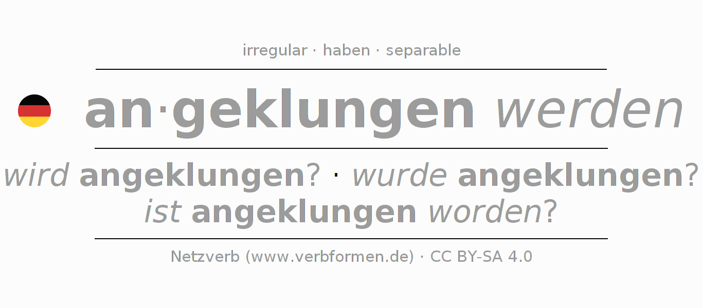 Ejemplos para la conjugación del infinitivo anklingen. Aquí tenemos fragmentos de texto reales y oraciones tomadas del proyecto Tatoeba. Por cada tipo de conjugación hay un ejemplo y la forma verbal se encuentra destacada. A veces hay más de una oración, pero en ese caso se seleccionará automáticamente un ejemplo del verbo alemán en cuestión. Para que además de aprender también practiques la conjugación del verbo, tenemos para ti Arbeitsblätter und Übungen hojas de trabajo disponibles.