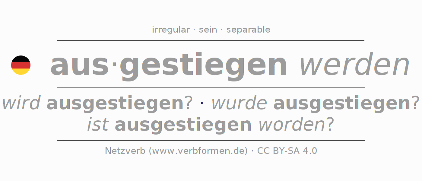 Ejemplos para la conjugación del infinitivo aussteigen. Aquí tenemos fragmentos de texto reales y oraciones tomadas del proyecto Tatoeba. Por cada tipo de conjugación hay un ejemplo y la forma verbal se encuentra destacada. A veces hay más de una oración, pero en ese caso se seleccionará automáticamente un ejemplo del verbo alemán en cuestión. Para que además de aprender también practiques la conjugación del verbo, tenemos para ti Arbeitsblätter und Übungen hojas de trabajo disponibles.